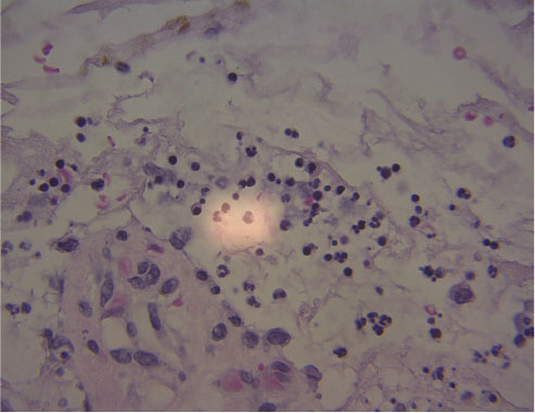 Figure 4. Higher power image demonstrating subepidermal blister cavity with numerous neutrophils.